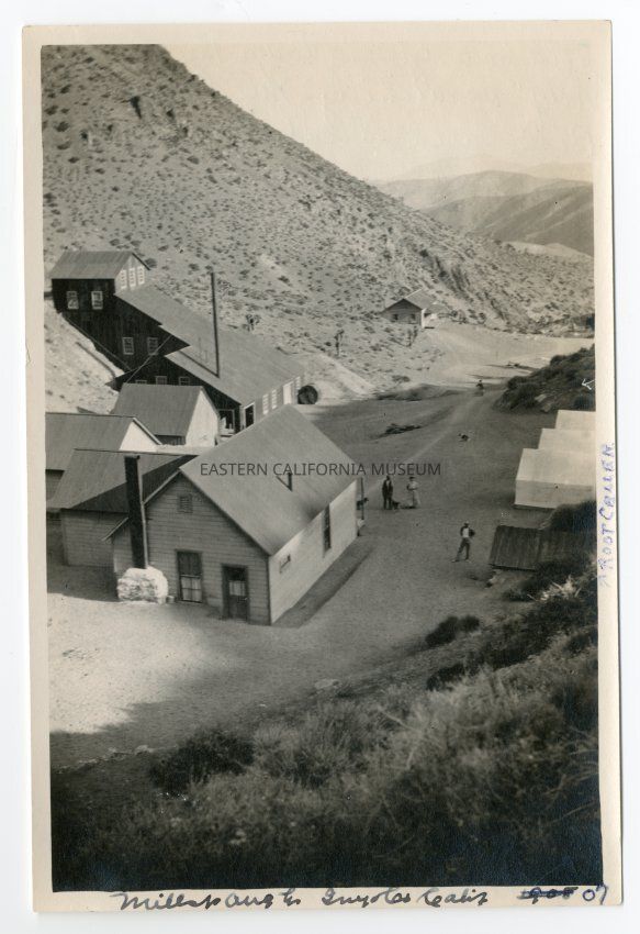 Photo of the Millspaugh mining camp taken from the hillside up Shepherd's Canyon looking down. The mill, post office, cook tent, assay office, and blacksmith shop are visible. There are several people standing around. Written in ink on edges of photo: along bottom "Millspaugh, Inyo Co. Calif., 1908 [date crossed out and replaced with 1907]," and along right side, "root celler."
