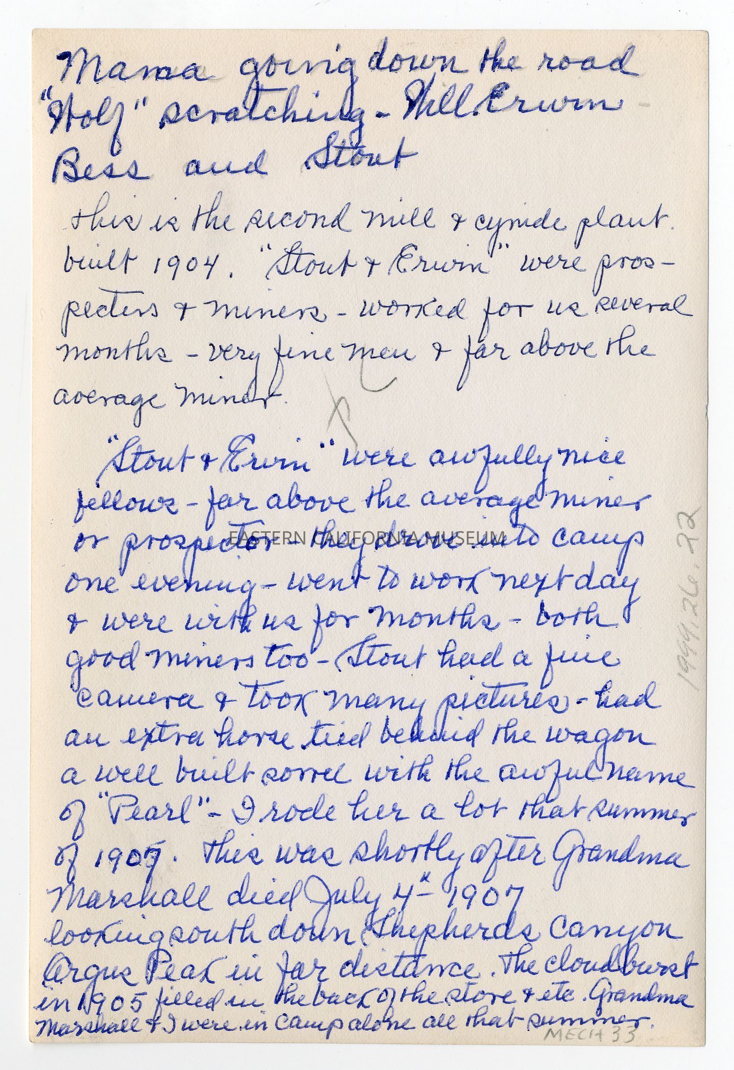 Written in blue and black ink on reverse: Mama going down the road "Wolf" scratching, Will Erwin, Bess, and Stout. This is the second mill and cynide plant built 1904. "Stout and Erwin" were prospectors and miners--worked for us several months--very fine men and far above the average miner. "Stout and Erwin" were awfully nice fellows--far above the average miner or prospector. They drove into camp one evening--went to work next day and were with us for months--both good miners too. Stout had a fine camera and took many pictures--hand an extra hourse tied behind the wagon as well built sorrel with the awful name of "Pearl." I rode her a lot that summer of 1907. This was shortly after Grandma Marshall died JUly 4, 1907. Looking south down Shepherd's Cnayon, Argus Peak in far distance. The cloudburst in 1905 filled in the back of the store and etc. Grandma Marshall and I were in camp alone all that summer.Collection