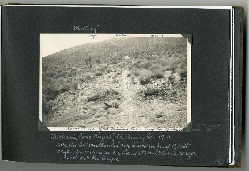 Caption on album page: "Mustang." Mecham's Coso Keyes Gold Mining Co. 1910. Note the International car truck in front of tent. 2 cylinder engine under the seat--built lik a wagon without the tongue.