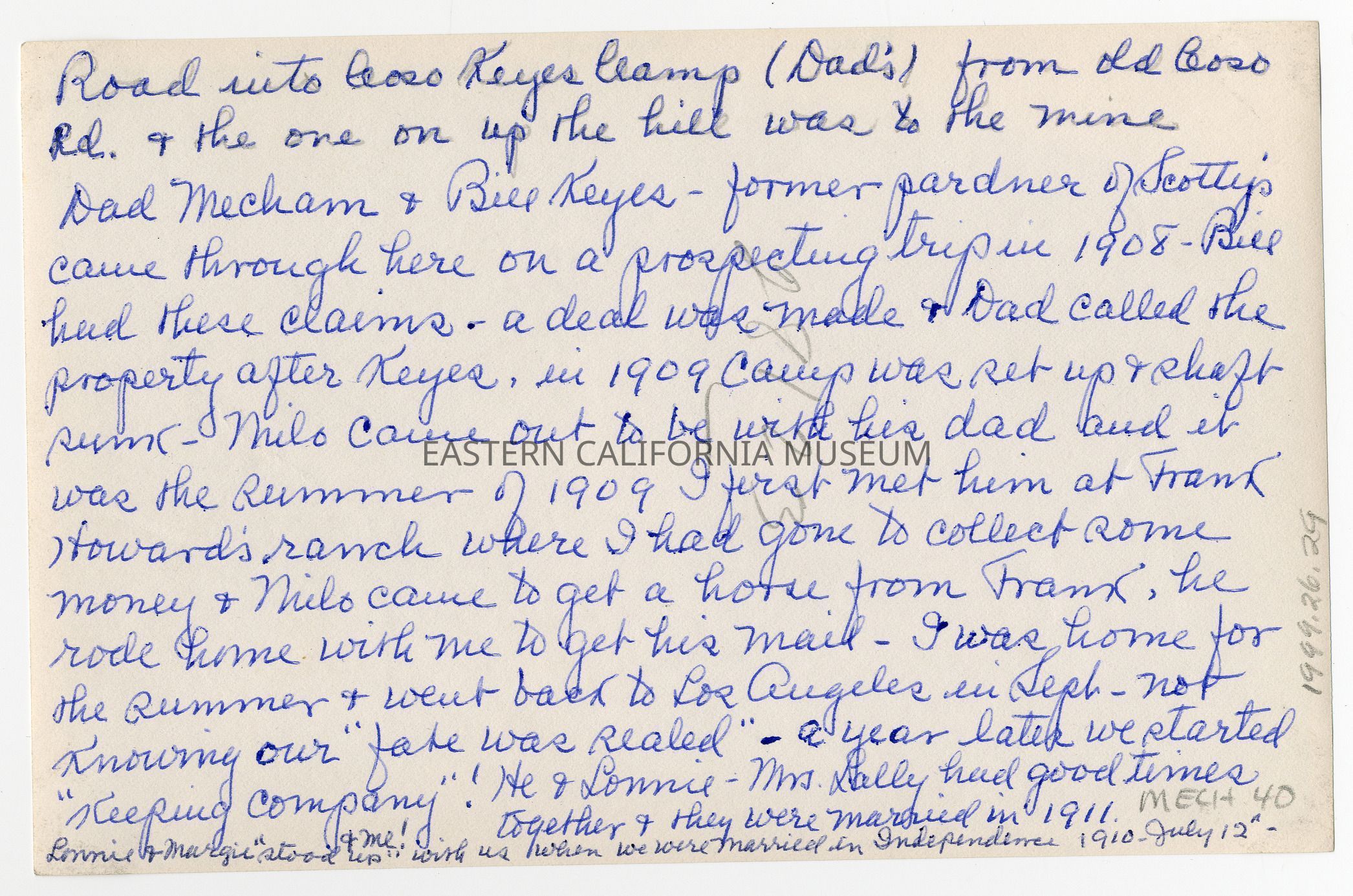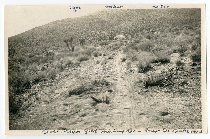 Written in blue ink on reverse: Road into Coso Keyes Camp (Dad's) from old Coso Rd. and the one on up the hill was to the mine. Dad Mecham and Bill Keyes--former pardner [partner] of Scotty's--came through here on a prospecting trip in 1908. Bill had these claims--a deal was made and Dad called the property after Keyes. In 1909 camp was set up and shaft sunk--Milo came out to be with his dad and it was the summer of 1909 I first met him at Frank Howard's ranch where I had gone to collect some money and Milo came to get a horse from Frank. He rode home with me to get his mail. I was home for the summer and went back to Los Angeles in Sept.--not knowing our "fate was sealted"--a year later we started "keeping company"! He and Lonnie and Mrs. Lally had good times together and they were married in 1911. Lonnie and Margie "stood up" with us when we were married in Independence 1910, July 12 [date listed elsewhere as July 12, 1912].Collection