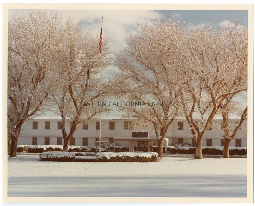 Color print of headquarters building, trees, and flagpole under snow. Likely the Naval Weapons Center at China Lake.