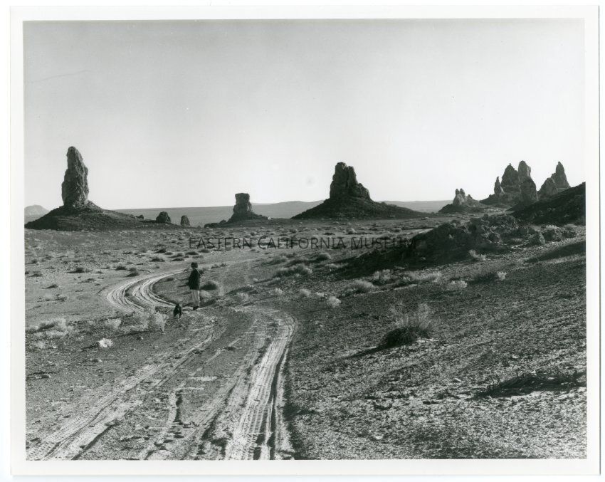 Black and white print of a person and dog standing in a dirt road or track in the middle of a desert. Tall rock monuments in background likely the Trona Pinnacles.Collection