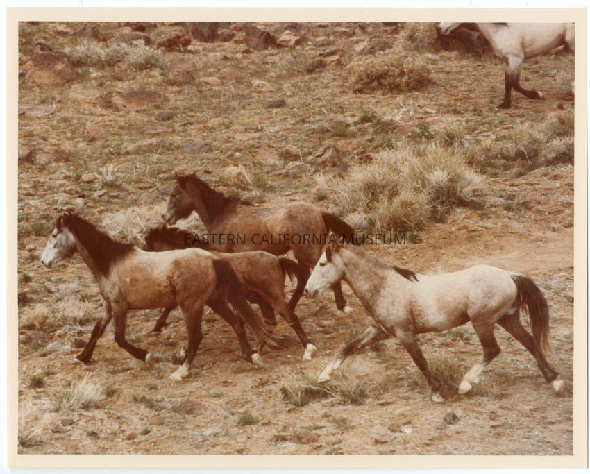 Color print of five horses walking through the brush. Possibly a wild horse herd?