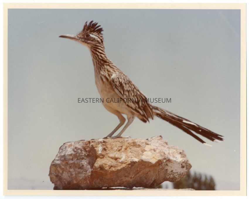 Color print of a roadrunner perched on a rock.