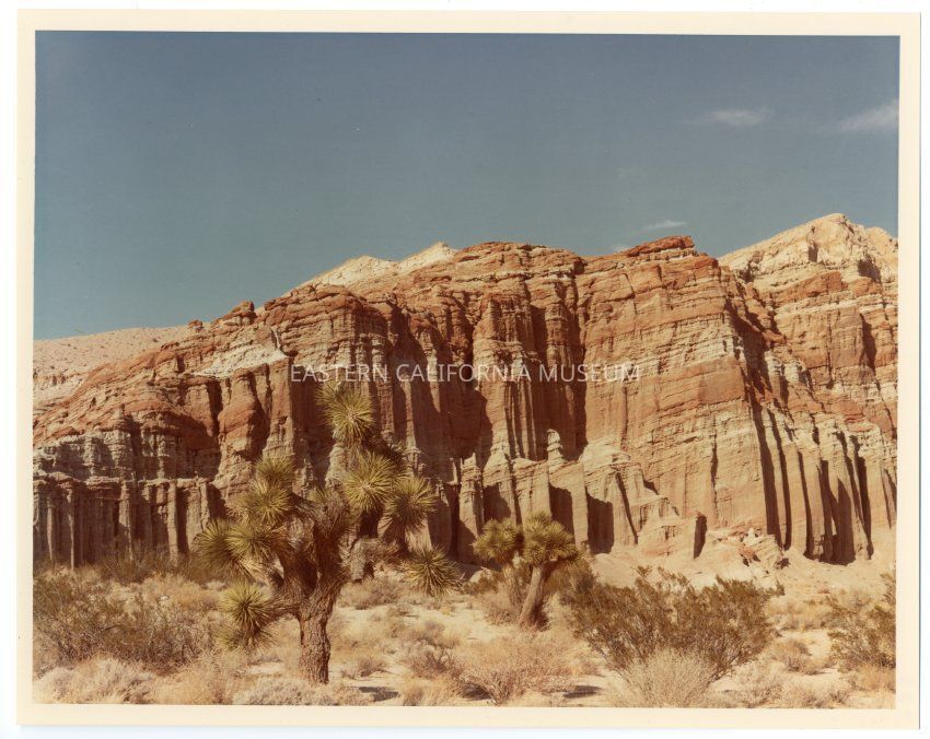 Color print of the rock formations at Red Rock Canyon and joshua (or yucca?) trees.