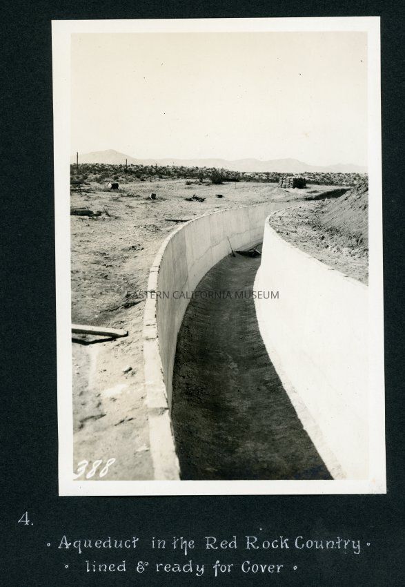 Black and white photo of an open, lined channel of the aqueduct. Has the number "388" in lower left corner.