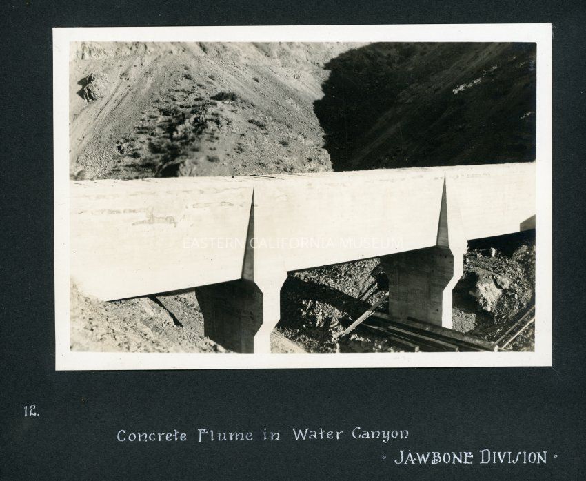 Black and white photo of a concrete flume spanning a canyon on a hillside. Caption: 12. Concrete Flume in Water Canyon Jawbone Division.