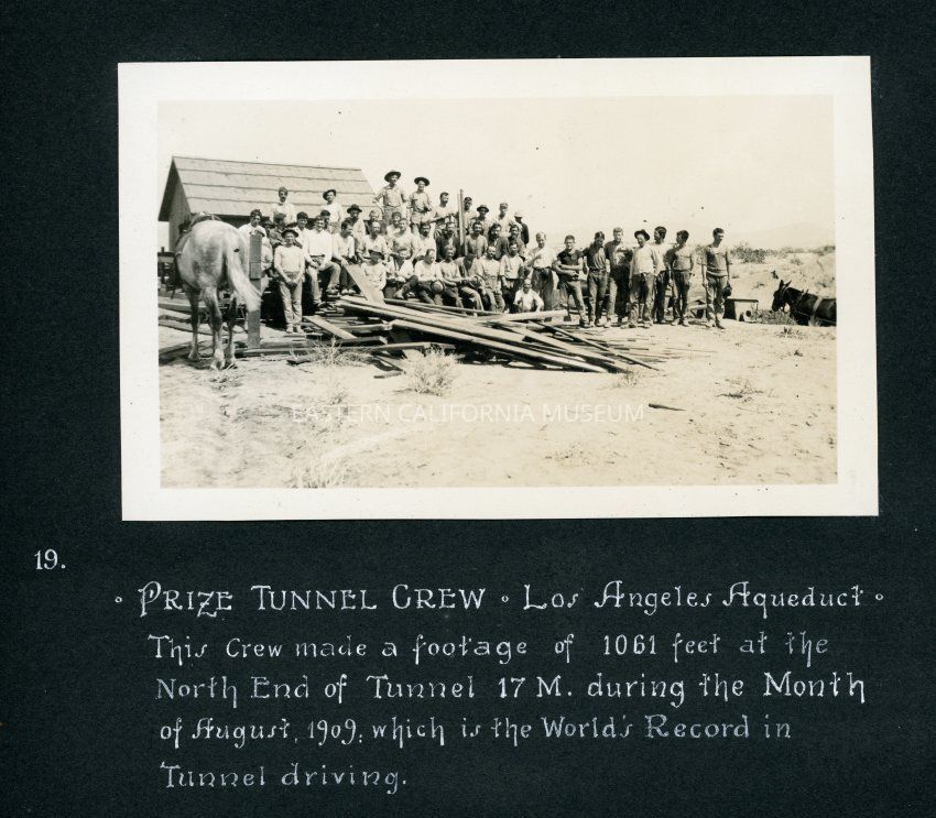 Caption: 19. Prize Tunnel Crew Los Angeles Aqueduct. This Crew made a footage of 1061 feet at the North End of Tunnel 17M. during the Month of August 1909, which is the World's Record in Tunnel driving.Collection