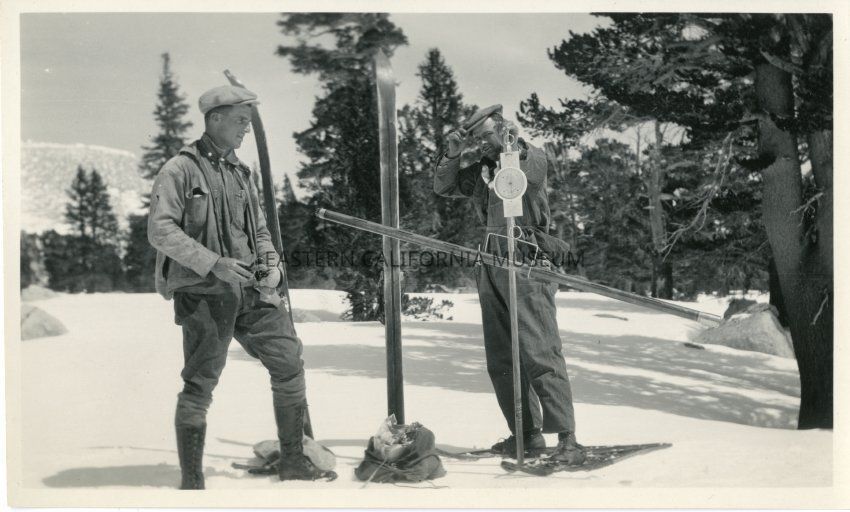A. R. Codd (left) and R. B. Spainhower (right) with skis, snowshoes, and snow survey equipment at elevation 11,100' while working on the Cottonwood Creek Snow Survey, 1926.Collection