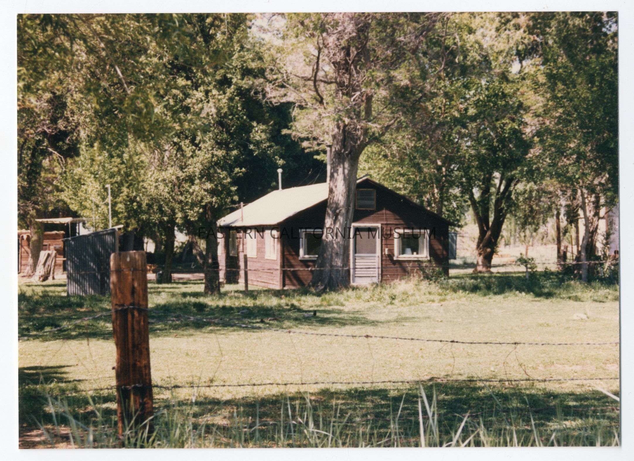 Color photo of a brown painted cabin surrounded by trees. Perhaps it was from Manzanar? Written in blue ink on reverse: #1 5/20/86.