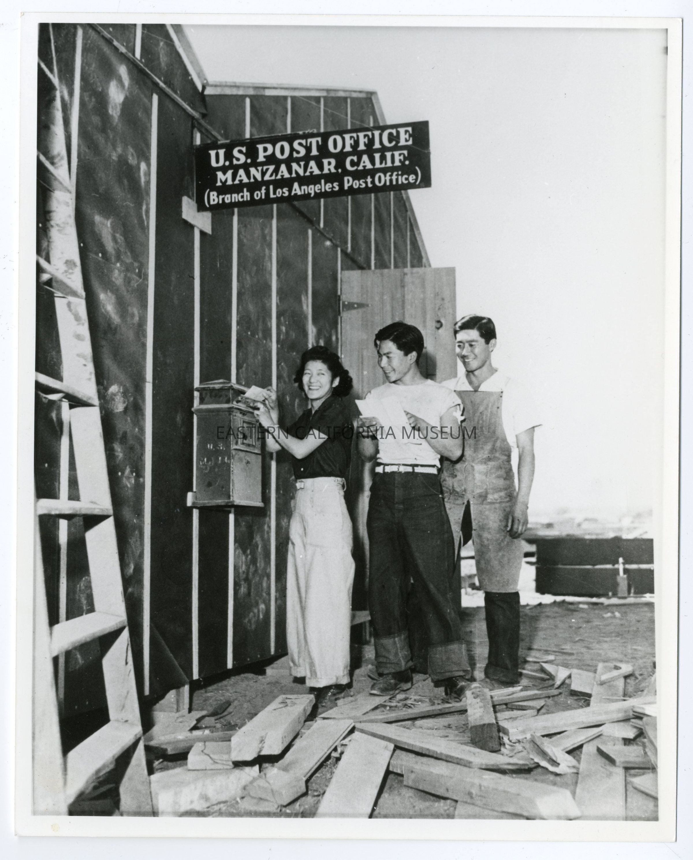 Copy of a b/w photo of three people posting a letter at the U.S. Post Office at Manzanar, Calif. It was a branch of the Los Angeles Post Office.