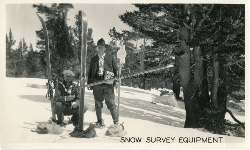 R. B. Spainhower (left) and J. E. Jones (right) with skis, snowshoes, and snow survey equipment while working on the Cottonwood Creek Snow Survey, 1926. Elevation 11,100'.