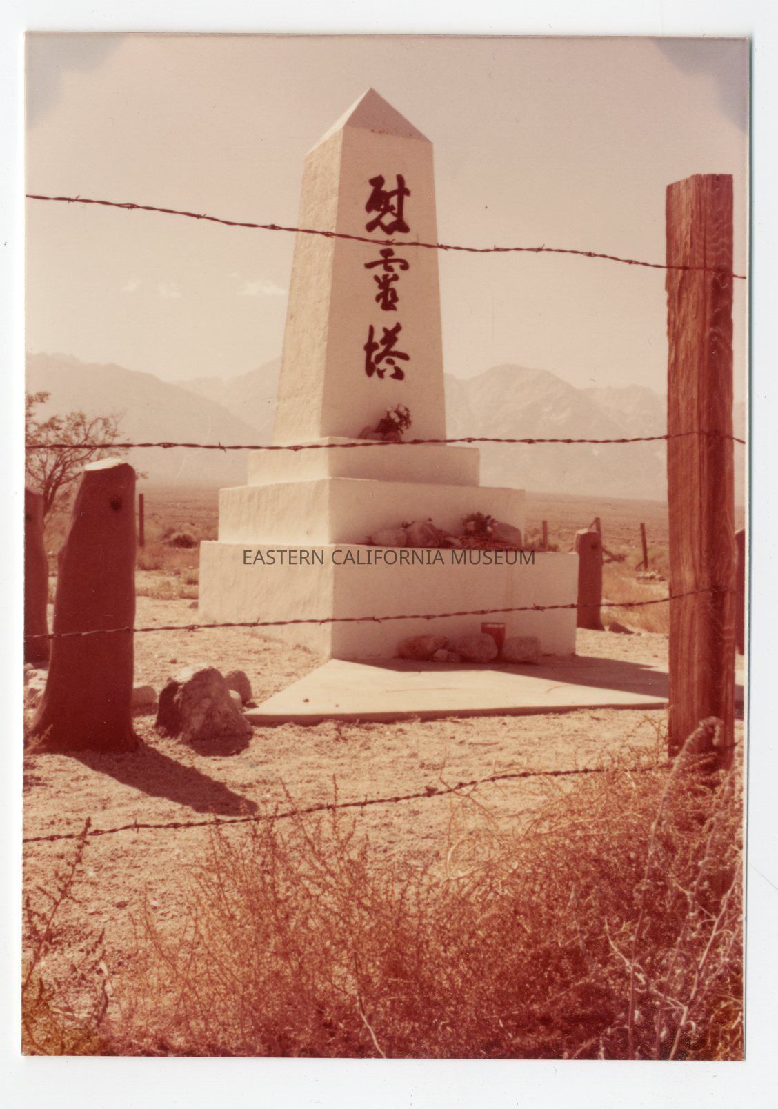 Color photo of the cemetery monument at Manzanar, taken from behind a barbed wire fence.Photograph Details