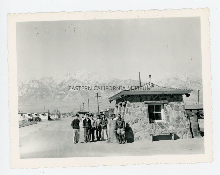 B/w photo of the stone sentry post at Manzanar War Relocation Center and a small group of people.