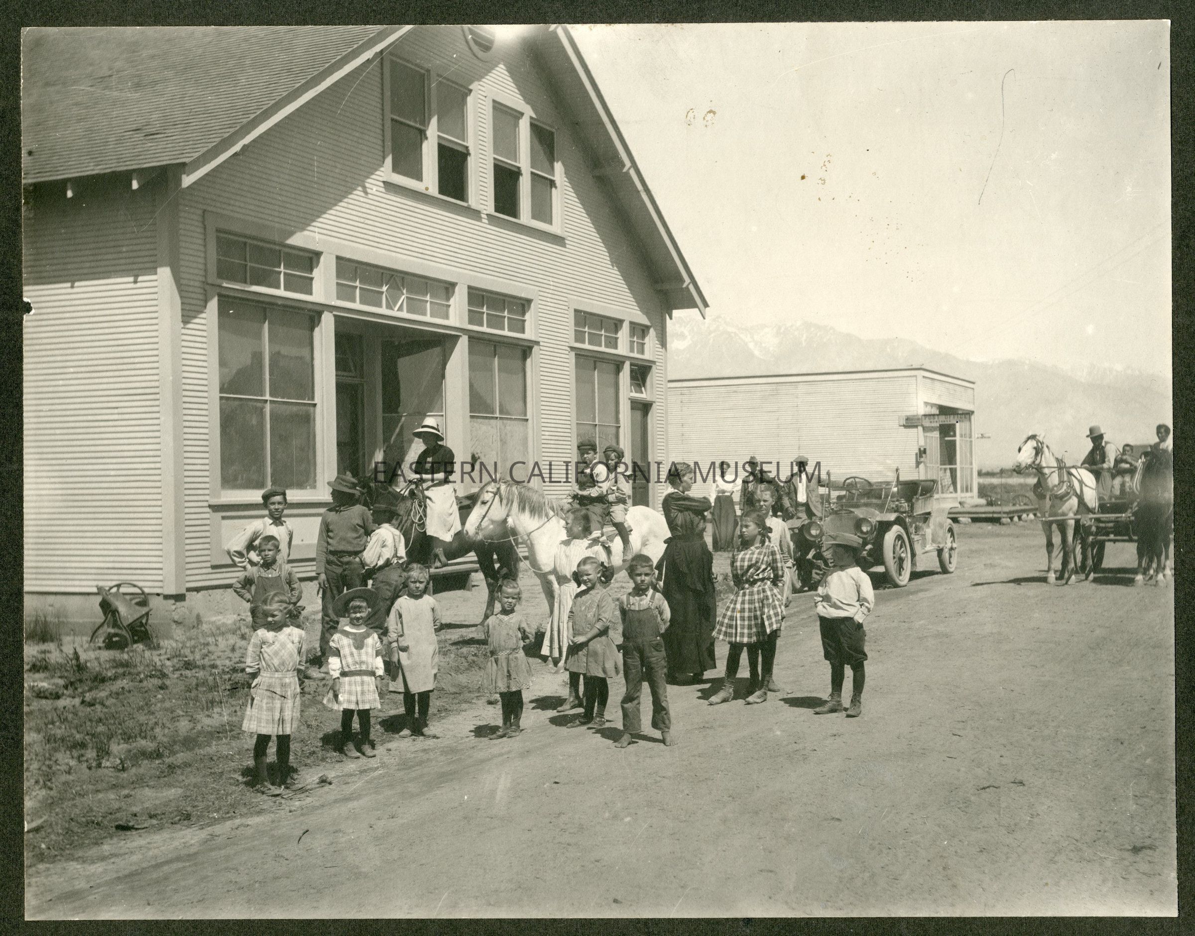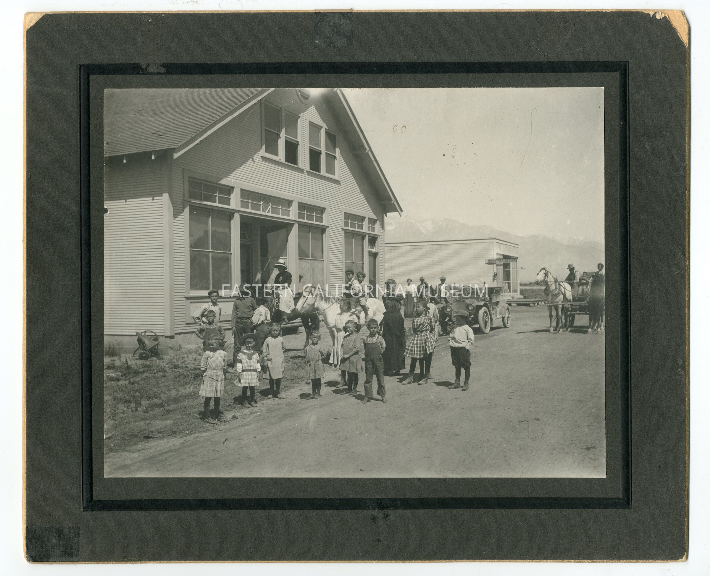 Large mounted photo of mostly children in front of a two story building. There is a second, rectangular building behind it, and the Sierra Nevada mountain range in the background. There are two children on a horse, a woman on a horse, an early vehicle, and several people in a horse-drawn buggy or wagon.
