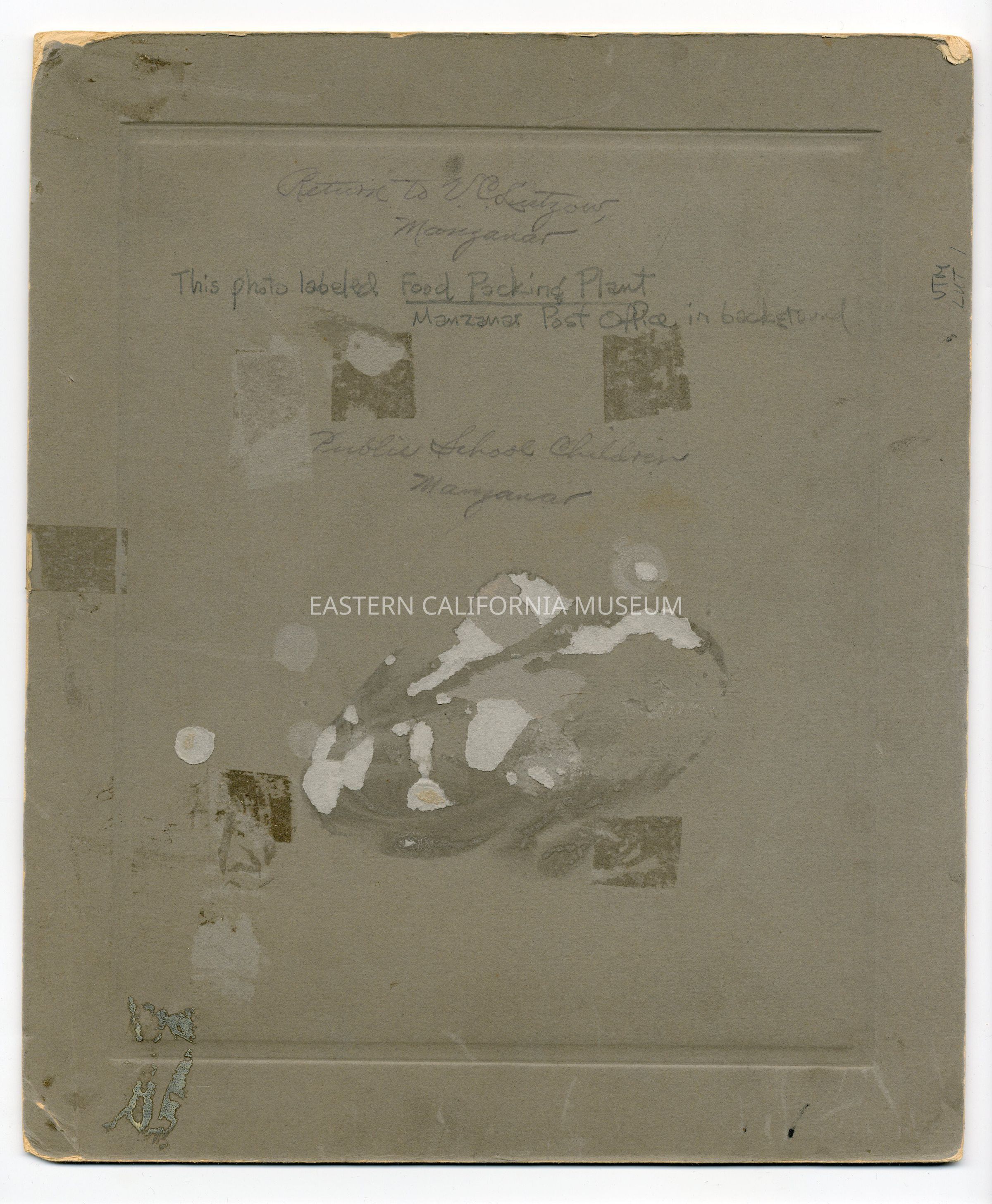 Written in pencil in a different hand on reverse: This photo labeled Food Packing Plant. Manzanar Post Office in background. Public school children, Manzanar.Photograph Details
