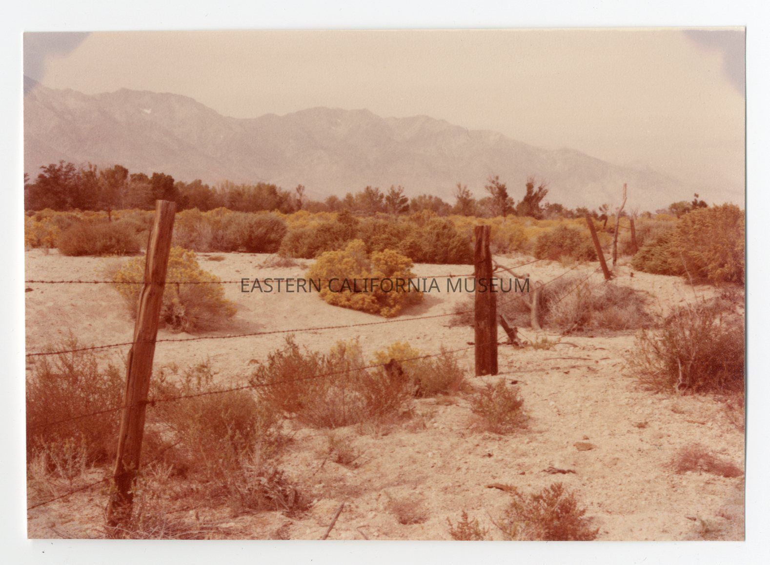 Color photo of the barbed wire fence that used to mark the boundary of Manzanar War Relocation Center.