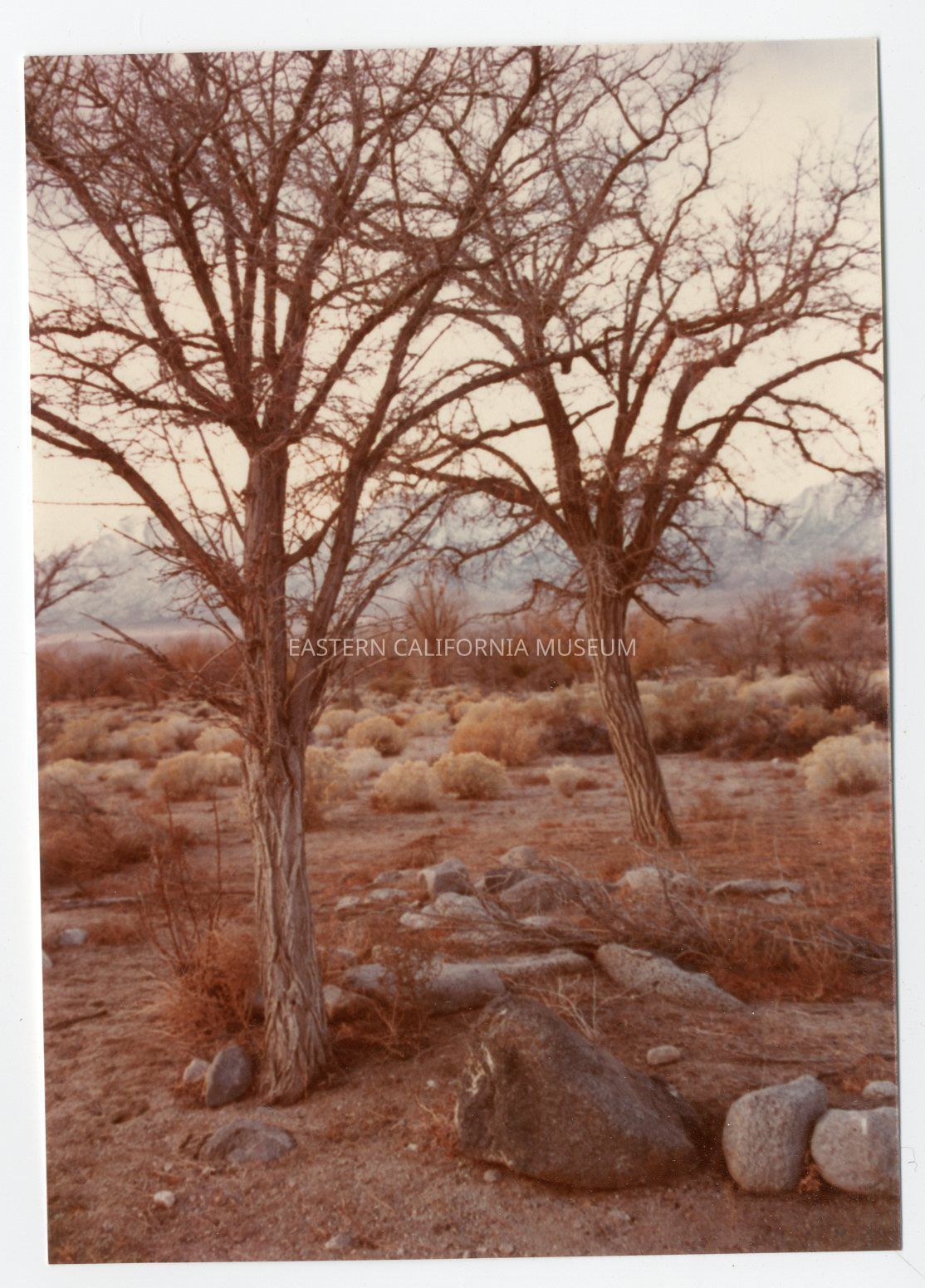 Color photo of two trees at Manzanar.