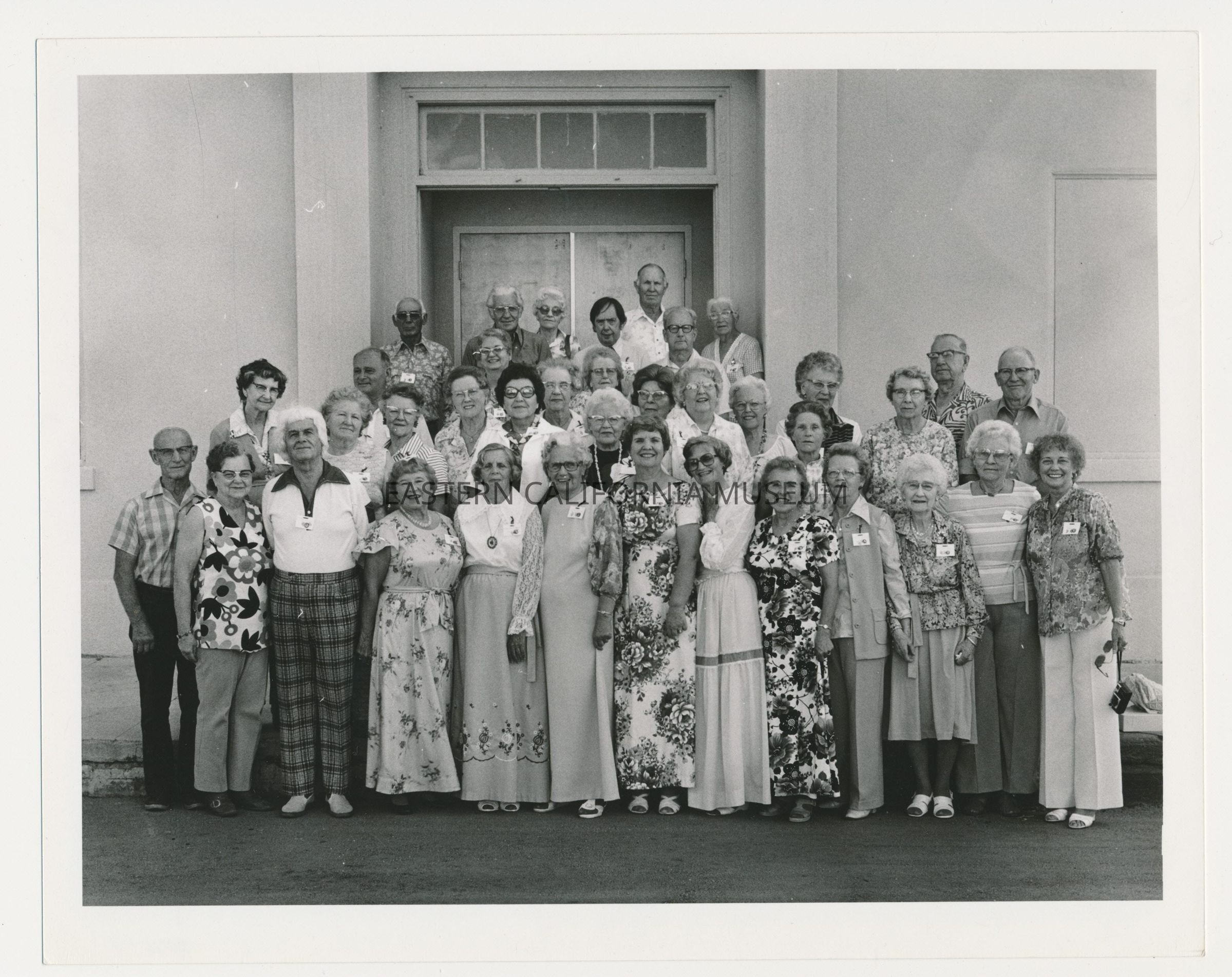 Group photo of the attendees of a Manzanar Town Reunion (date unknown). They may be standing in front of the Manzanar Community Hall.