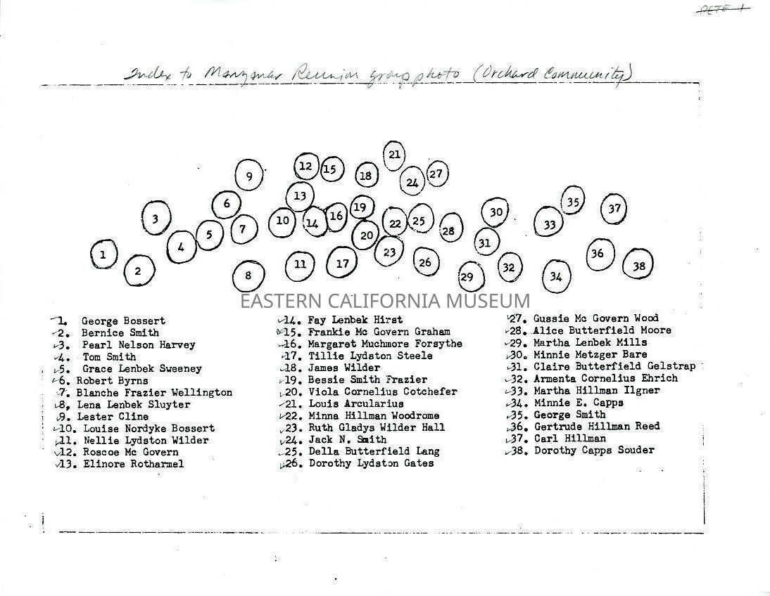 There is a paper with IDs with the photo and it lists the following: George Bossert, Bernice Smith, Pearl Nelson Harvey, Tom Smith, Grace Lenbek Sweeney, Robert Byrns, Blanche Frazier Wellington, Lena Lenbek Sluyter, Lester Cline, Louise Nordyke Bossert, Nellie Lydston Wilder, Roscoe McGovern, Elinore Rotharmel, Fay Lenbek Hirst, Frankie McGovern Graham, Margaret Muchmore Forsythe, Tillie Lydston Steele, James Wilder, Bessie Smith Frazier, Viola Cornelius Cotchefer, Louis Arcularius, Minna Hillman Woodrome, Ruth Gladys Wilder Hall, Jack N. Smith, Della Butterfield Lang, Dorothy Lydston Gates, Gussie McGovern Wood, Alice Butterfield Moore, Martha Lenbek Mills, Minnie Metzger Bare, Claire Butterfield Gelstrap, Armenta Cornelius Ehrich, Martha Hillman Ilgner, Minnie E. Capps, George Smith, Gertrude Hillman Reed, Carl Hillman, Dorothy Capps Souder.Photograph Details