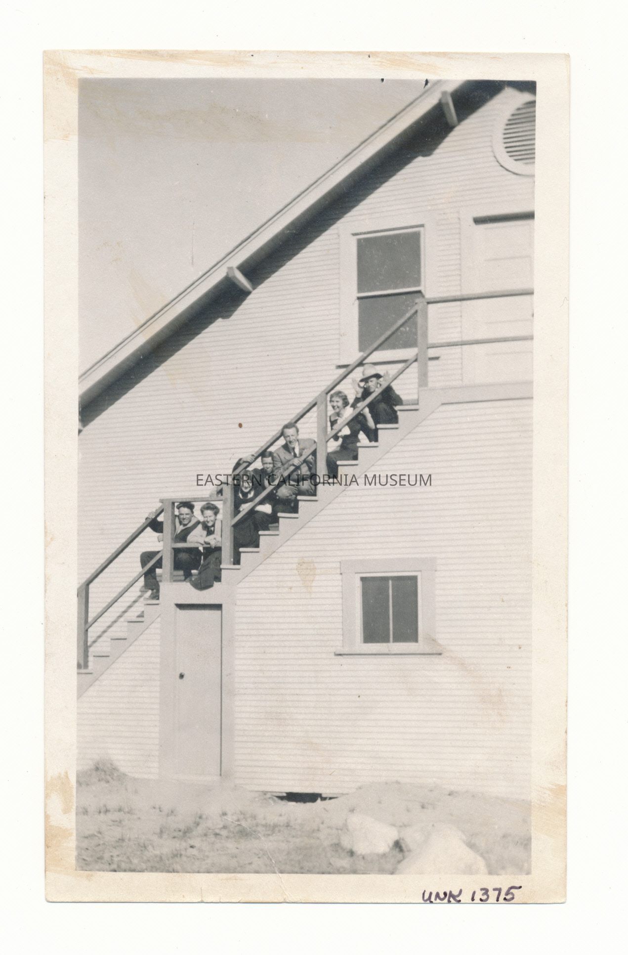 Photo of seven people posing on an exterior staircase to the upper floor of the packing house at Manzanar.