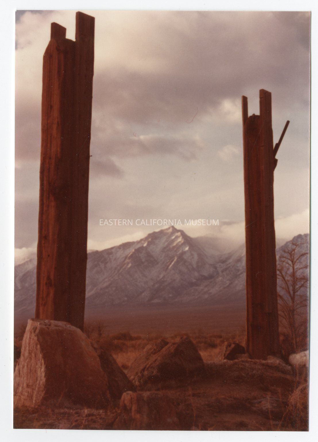 Color photo of the remains of the posts which used to support the entrance sign at Manzanar War Relocation Center.