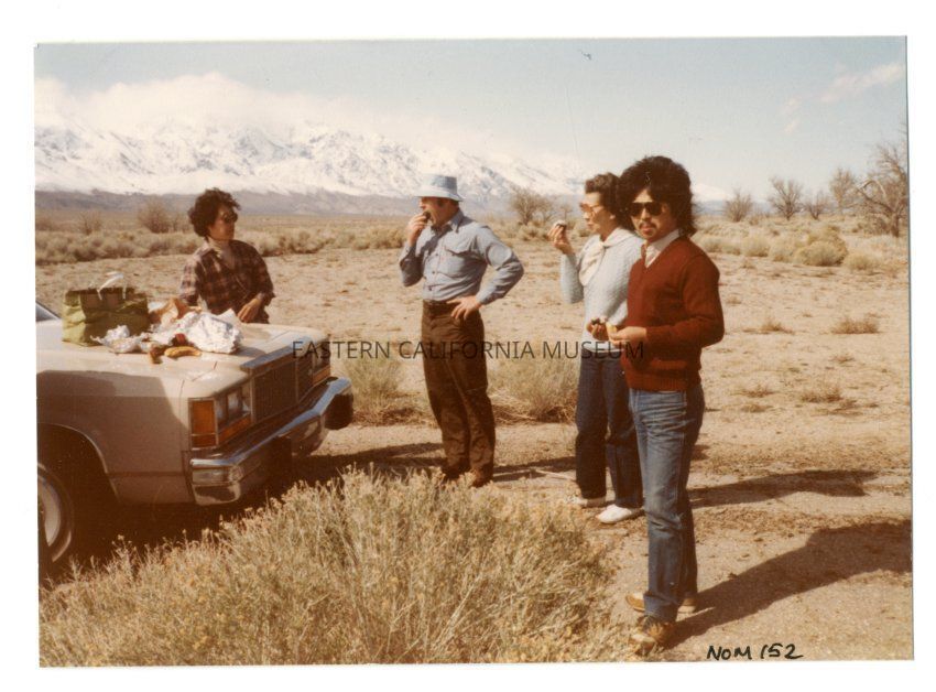 Color photograph of four people standing around the front of an automobile eating food that is spread out over car's hood at Manzanar with snow covered Sierra in background. On the left is Sue Embrey, and 2nd from right is Mary Nomura. The other two people are not identified. Photo is from the NHK TV Tokyo Production filmed on site at Manzanar in April 1984.Photograph Details