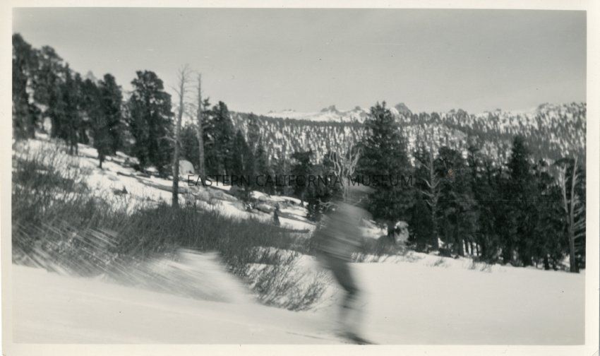Information from photo log: Log No. XVI. Cottonwood Creek Snow Survey. Elevation 11,100 ft. Looking East. This was an attempt to catch Codd in picture as he was skiing past me down Hill.Collection