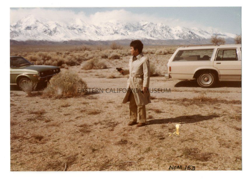 Color photograph of a man standing in front of two automobiles with snow covered Sierra in background at Manzanar. Photo is from the NHK TV Tokyo Production filmed on site at Manzanar in April 1984.Photograph Details