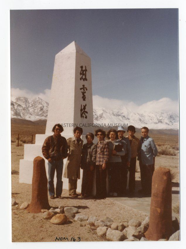 Color photograph of eight people standing in front of white obelisk at the Manzanar Cemetery. From left to right in the photo: unknown, unknown, Grace Harata, Sue Embrey, Mary Nomura, unknown, unknown, Shi Nomura. Snow covered Sierra in the background. Photo is from the NHK TV Tokyo Production filmed on site at Manzanar in April 1984.Photograph Details