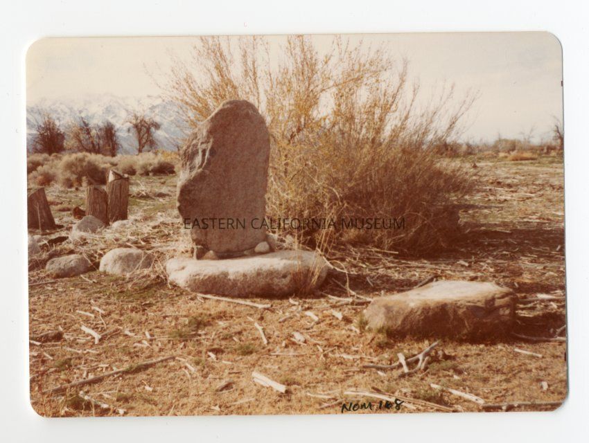 Color photograph of upright stone monument at Pleasure Park, later named Merritt Park, with the Sierra in the background.