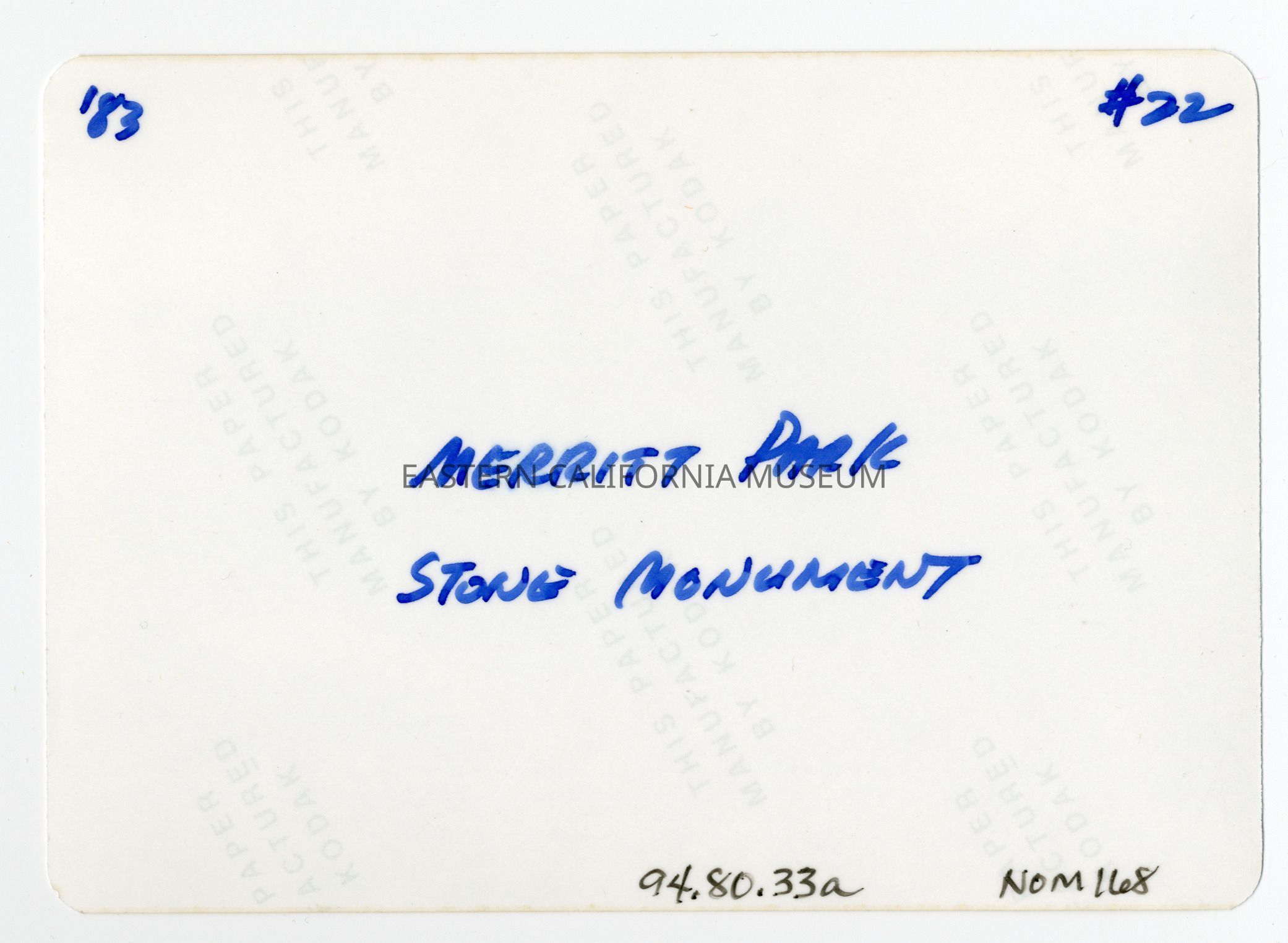 Reverse side labeled in Shi Nomura's handwriting in blue ink: " '83 #22 Merritt Park stone monument."Photograph Details