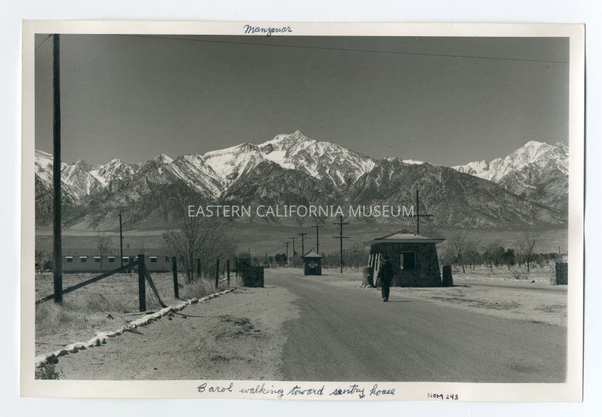 Written along top edge of photo is "Manzanar" and along bottom edge is "Carol walking toward sentry house." Photo was likely taken by Lou Frizzell.Photograph Details