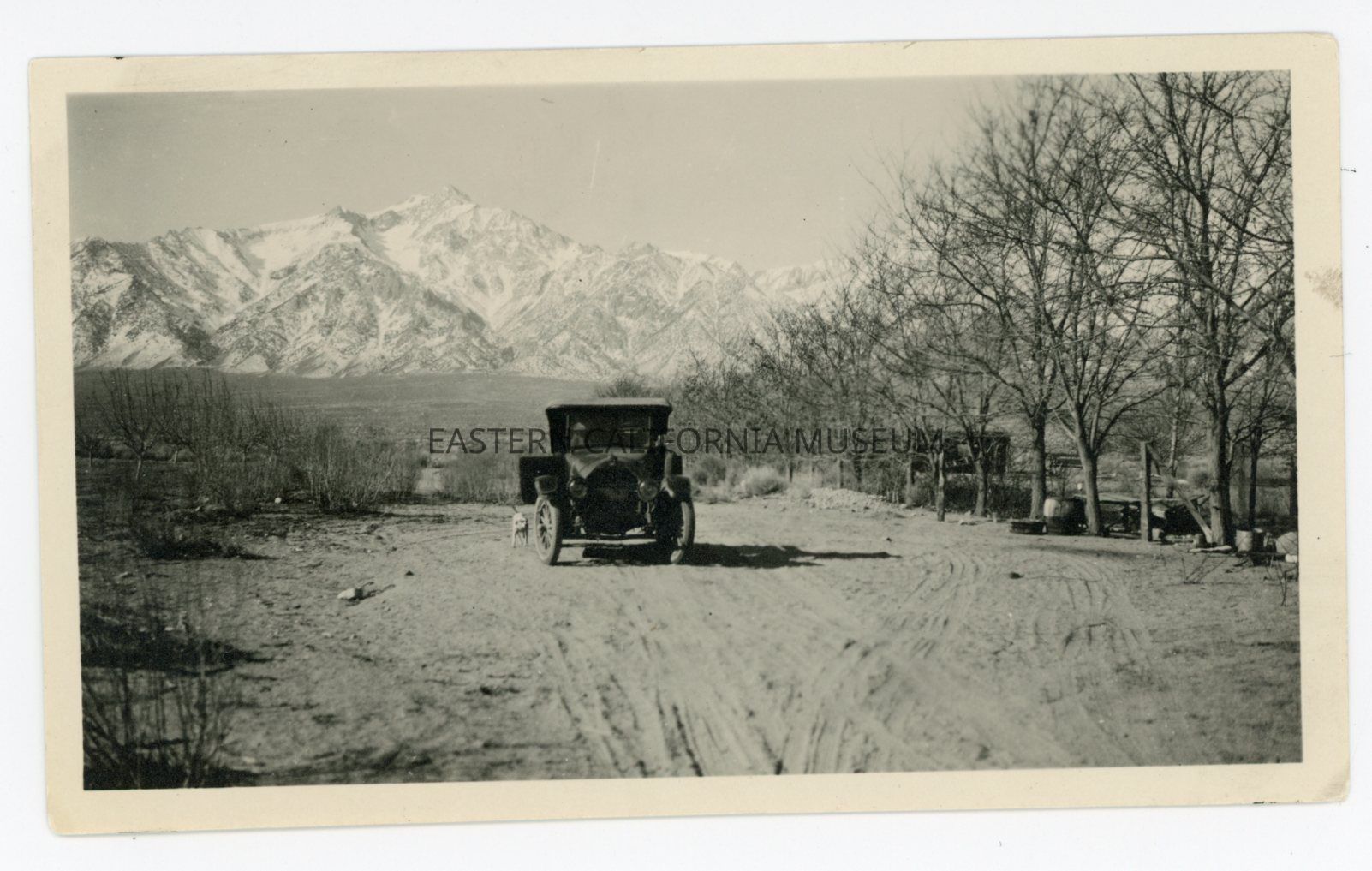 Photo of a vehicle parked on a dirt road with snow-covered Mt. Williamson in the background. There is a row of trees on the right side. Location is likely Manzanar.