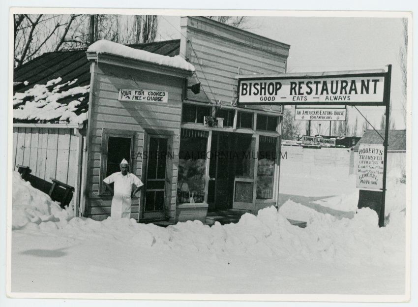 Photo of a man standing in front of Bishop Restaurant with snow up to his knees. There are signs for Roberts Transfer Office General Moveing [sic], Complete Automotive, "Your Fish Cooked Free of Charge," and "An American's Eating House for Americans."