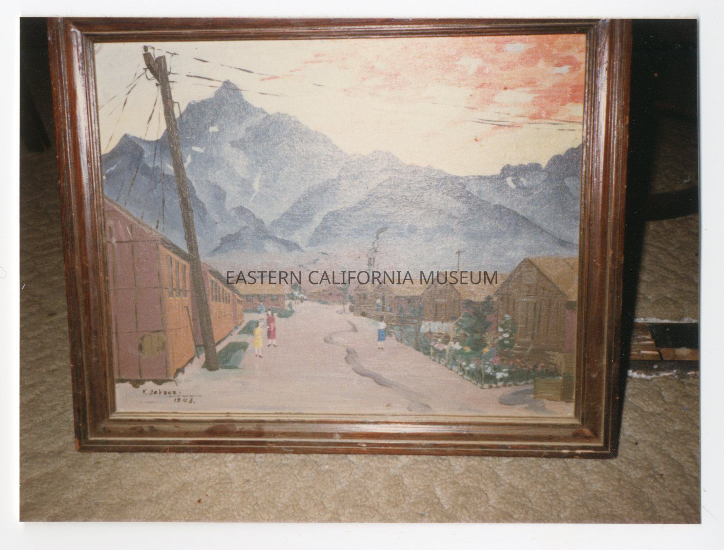 Color photo of a framed painting showing several wood buildings, a garden, a few people, and a large mountain peak in the background. It is signed and dated in the lower left corner: K. Uetsuei, 1943.