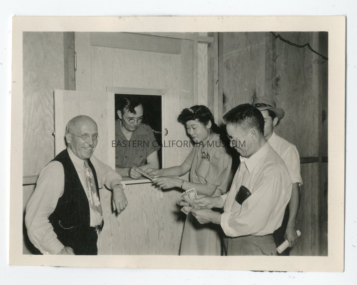 Typewritten label: Pay Day. First Pay in Three and One-Half Months. Roy Nash, Project Director, Edwin H. Hooper, Chief Fiscal Accountant, Oko Murata, Ted Akahoshi, Manzanar's first "Mayor," and George Akahoshi.Photograph Details