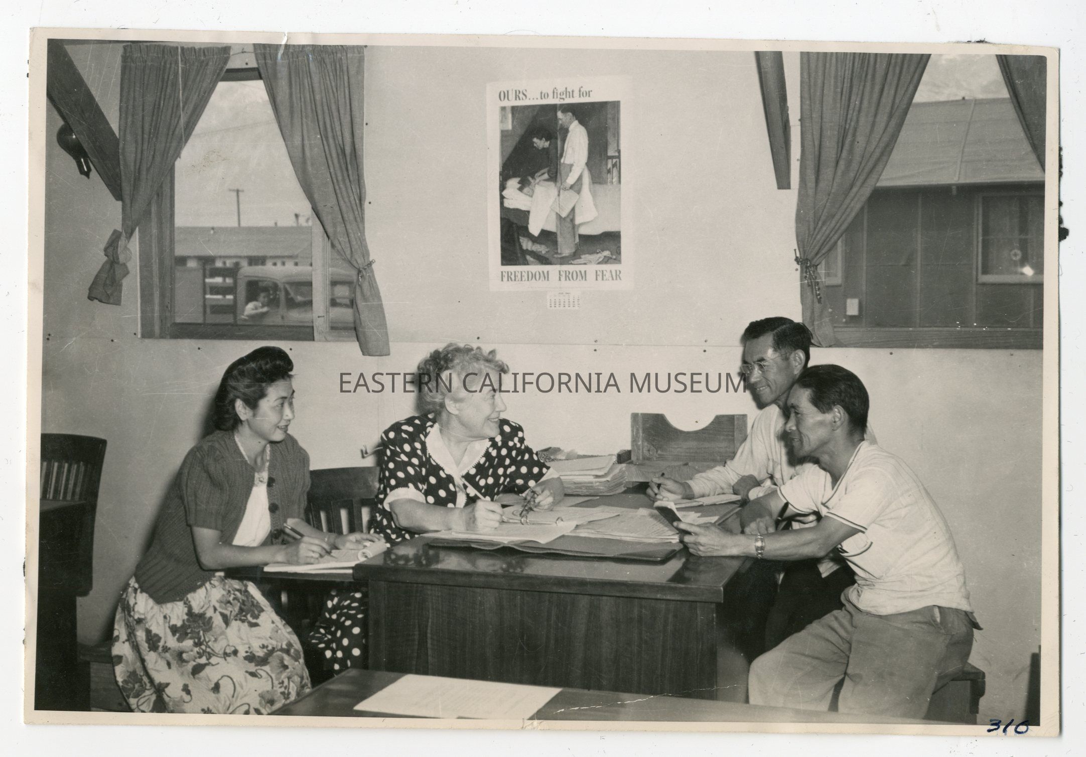 B/w photo of an elderly Caucasian woman with three younger Japanese people sitting around a table. There is a poster or calendar on the wall above them that says, "Ours...to fight for. Freedom from Fear." They are likely staff members of the Community Welfare department at Manzanar War Relocation Center.