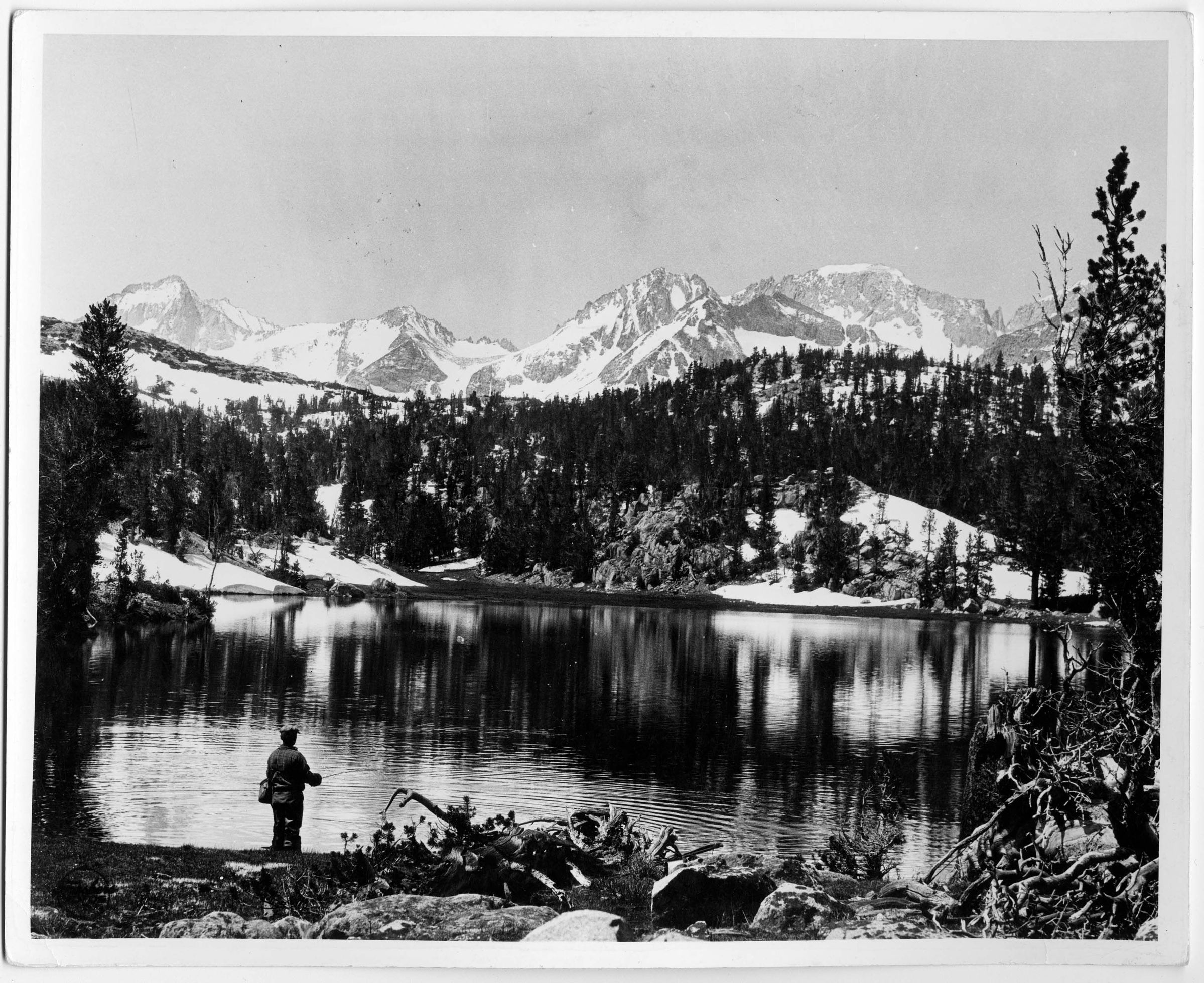Photo of a man fishing on the shore of a mountain lake. There is a lot of snow on the opposite bank.