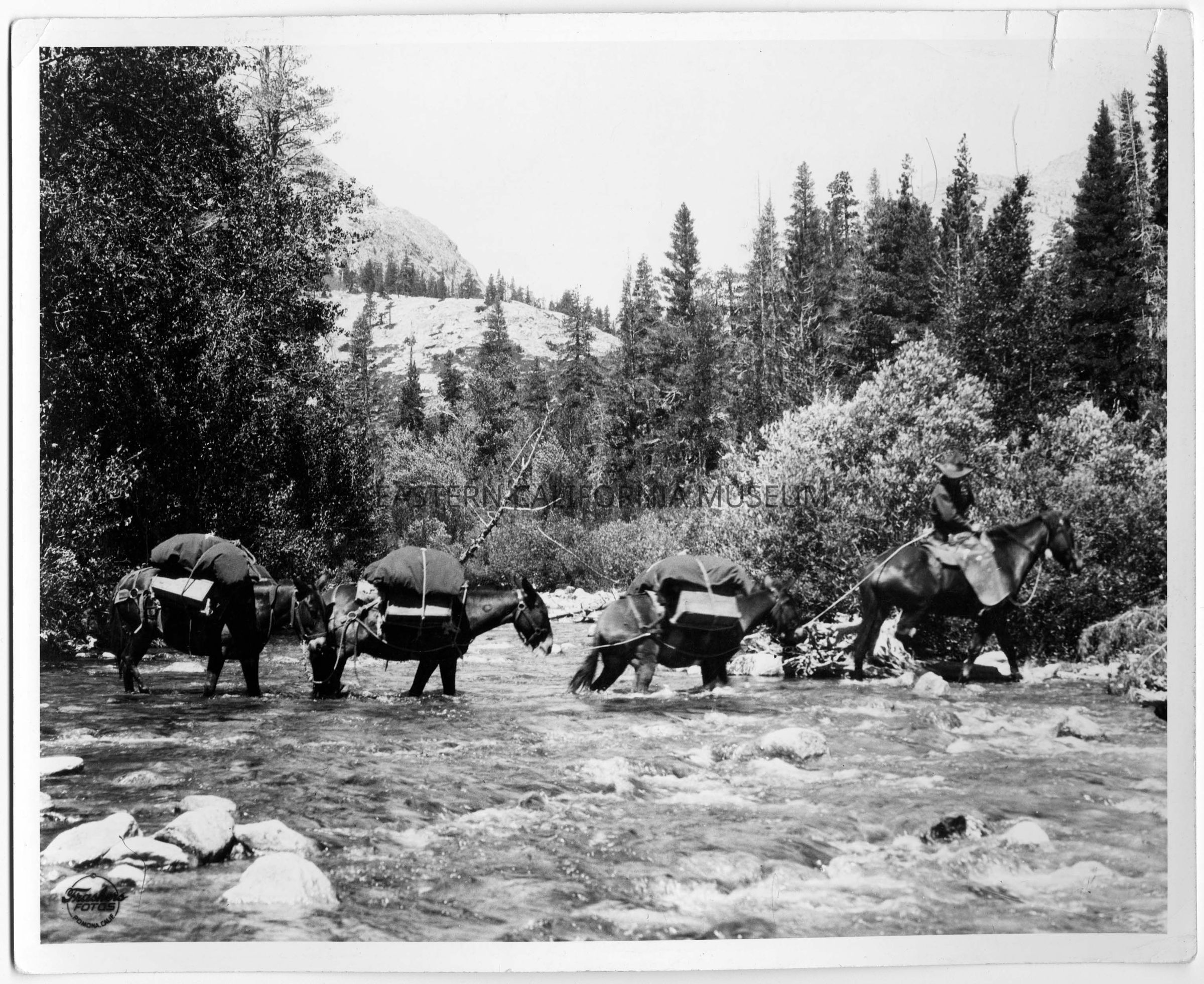 Photo of a pack train crossing a river. A man on horseback is leading three loaded pack mules.