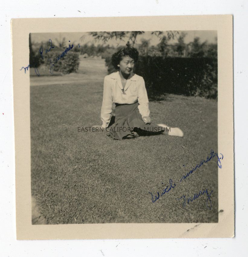 B/w photo of Mary Kageyama sitting on a grassy lawn. Written in blue ink in the top left and lower right corners is, "My pal [illegible]. With sincerity, Mary."