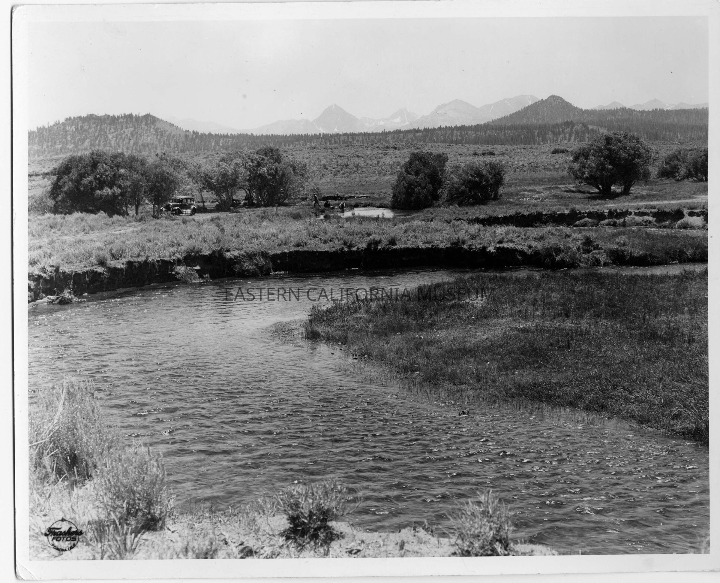 Photo of a river meandering through a meadow. There is an automobile and three people near the river's edge in the distance.