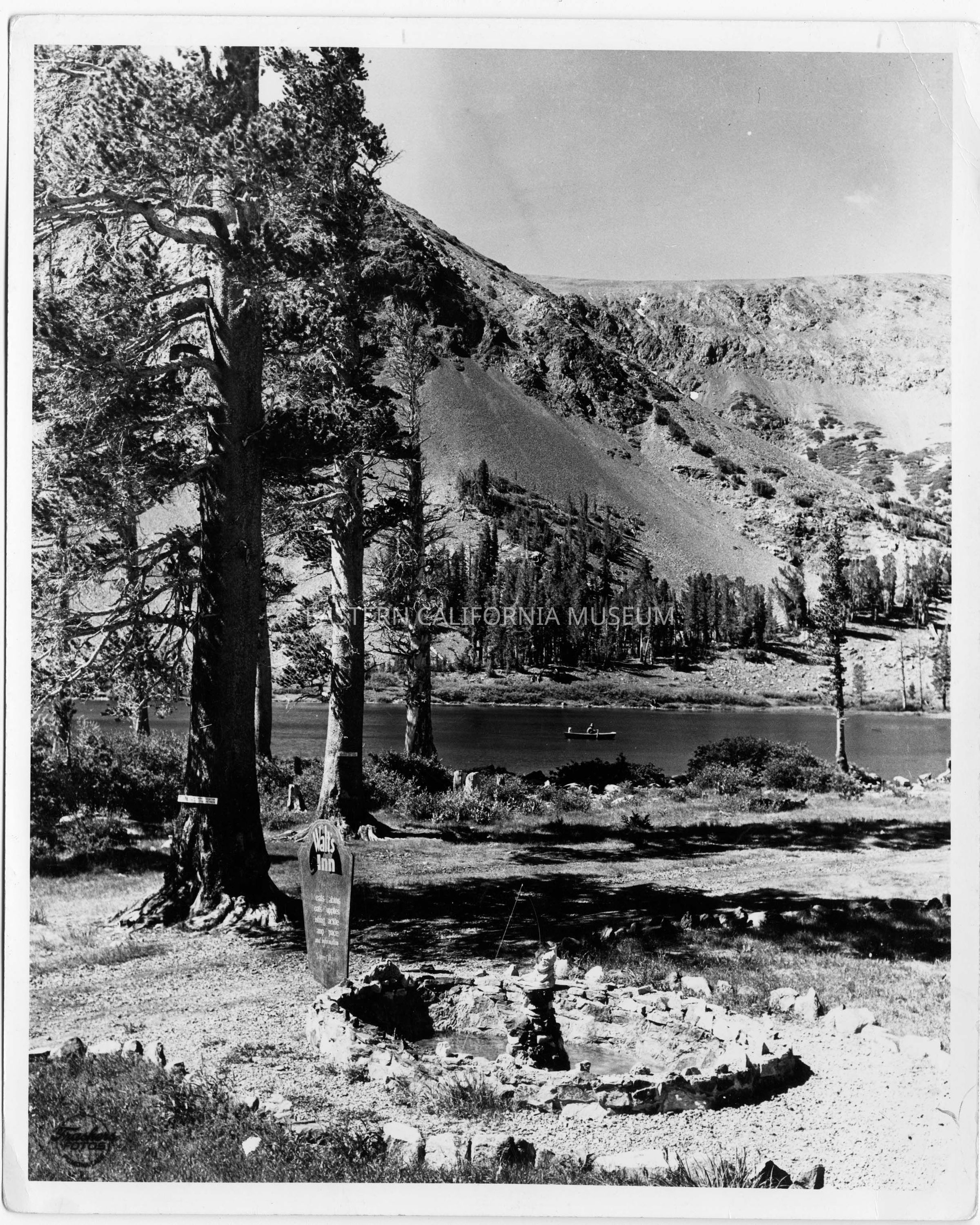 Photo of a campground called "Walt's Inn." There is a lake in the background with a boat on it and a small rock fountain in the foreground.