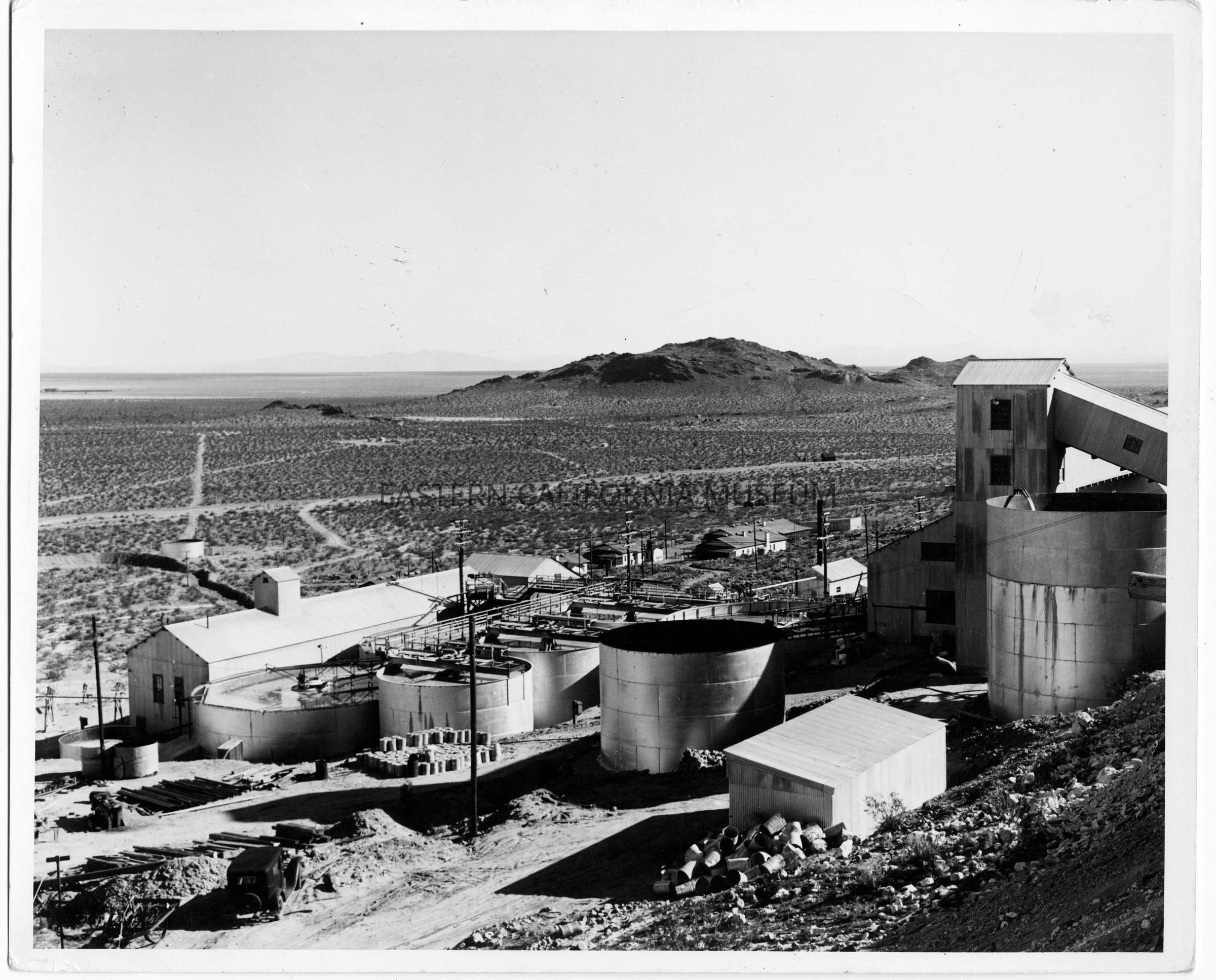 Photo of a mining camp. There are many structures, some of which are round, and one of which is a many storied tower (hoist works?). Possibly Red Mountain.
