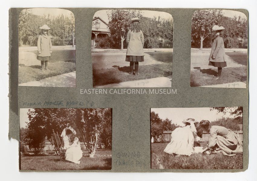 A1831.1.29e: Exterior photo of a girl (Helen Gunn?) and a woman playing with a doll on a grass lawn. Location is likely the Hannah House in Independence.Collection