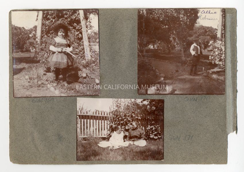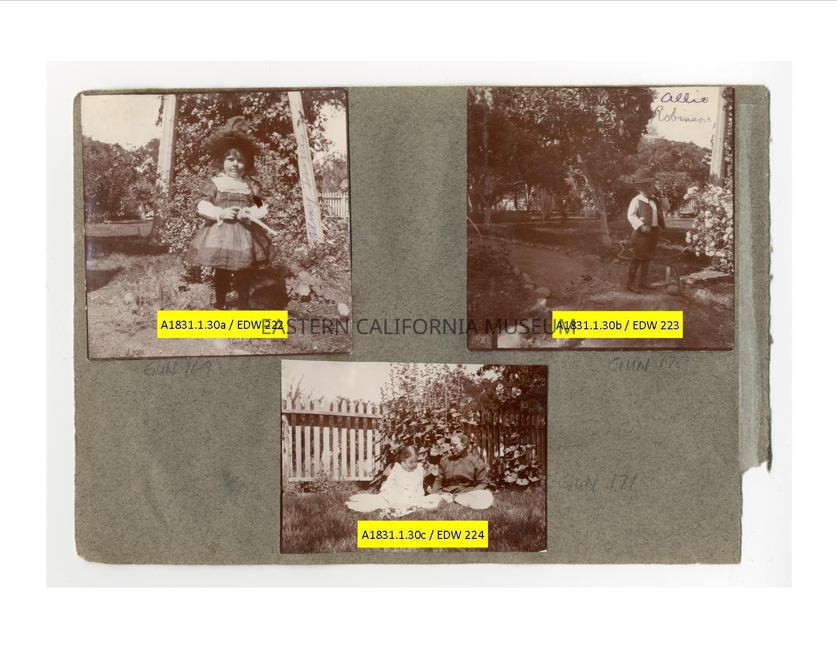 A1831.1.30b: Photo of a young boy standing on a dirt pathway, likely at the Hannah House in Independence. He is identified as Allie Robinson.