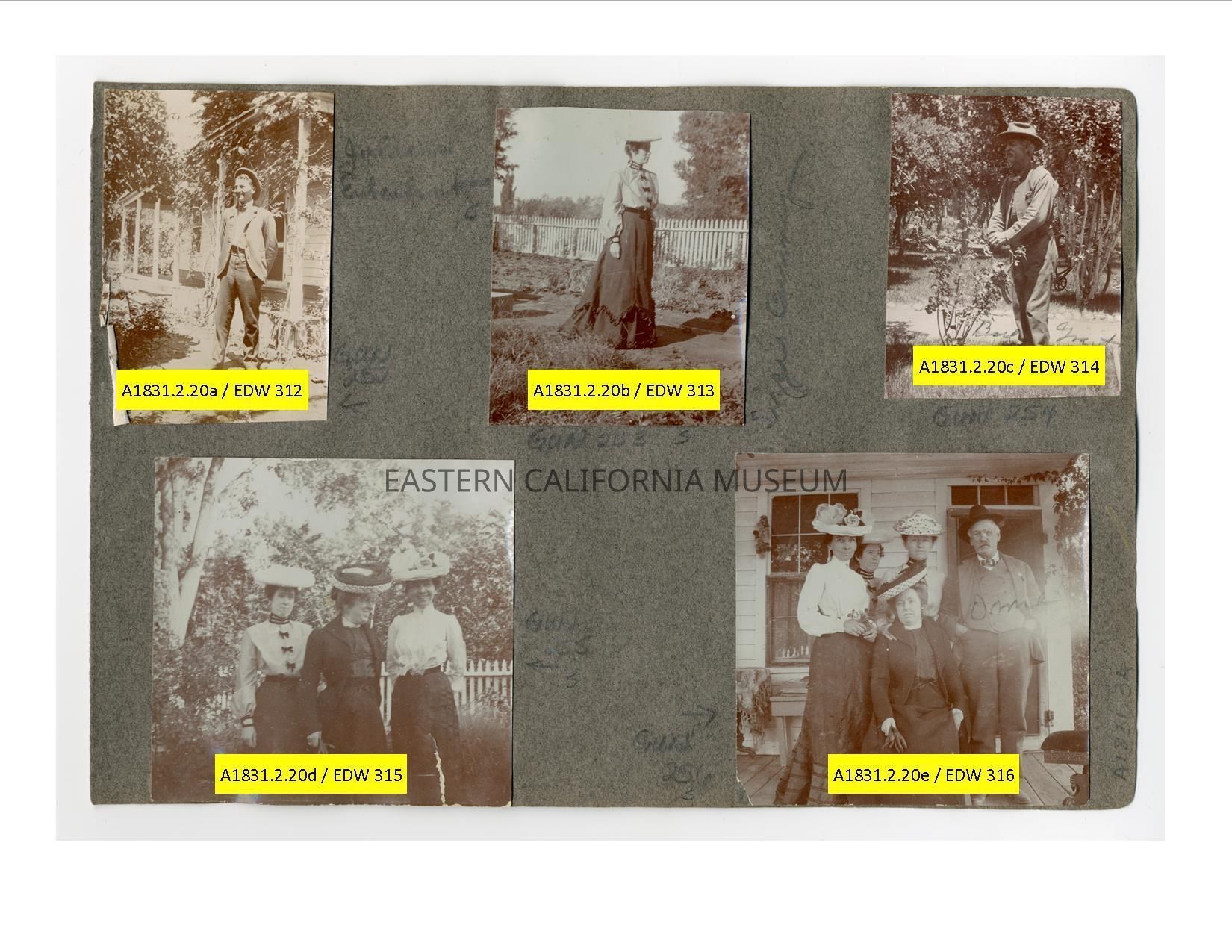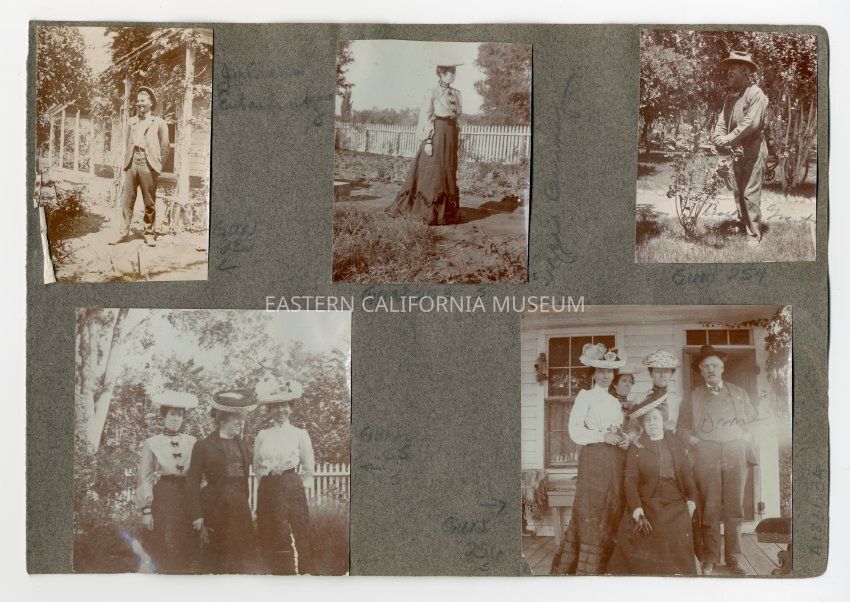 A1831.2.20e: Exterior photo of four women and a man standing on a house porch. They are identified from left to right as Maggie Bunney, Lizzie Bunney (in back), Arizona Bunney, Blanche Bunney, and Omie Mairs.Collection