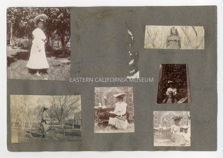 A1831.2.29a: Exterior photo of a young woman in a white dress and hat. She is identified as Helen Gunn.