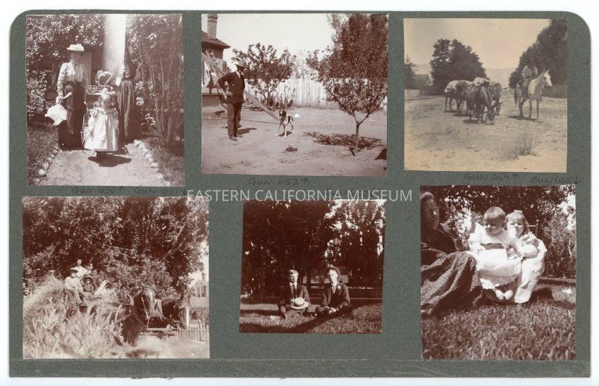 A1831.5.14b: Exterior photo of three people (one is a young child) on a horse drawn hay wagon. There is a house in the background. Location is likely Shepherd's Ranch near Georges Creek, and the man on the left may be John Shepherd.