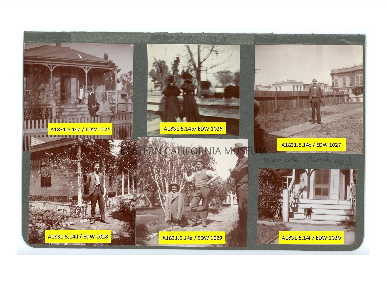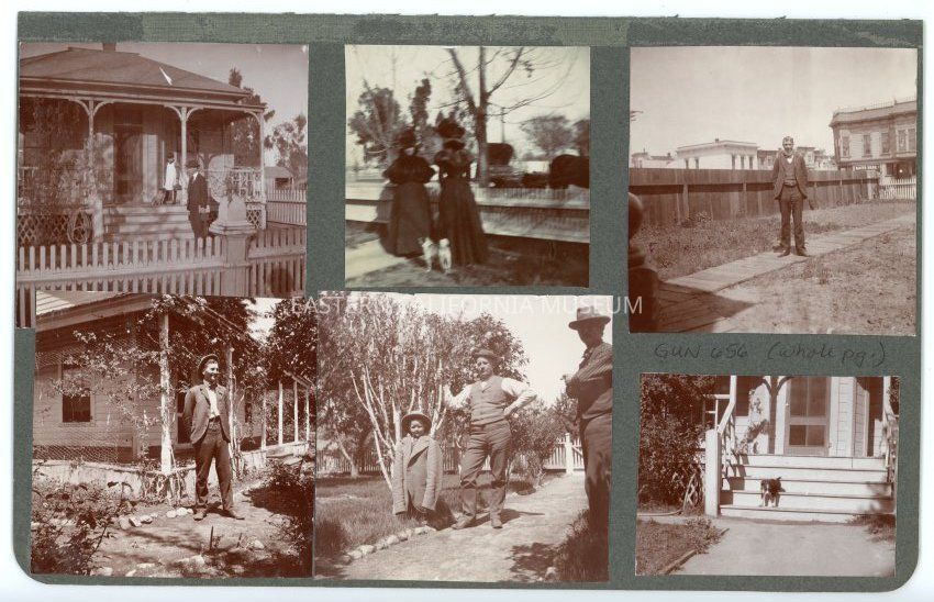 A1831.5.14c: Exterior photo of a man standing on a wooden boardwalk in a sandy, bare yard. Behind him are many tall buildings, one of which has a sign saying, "Ratto Bros." Possibly Oakland, CA?